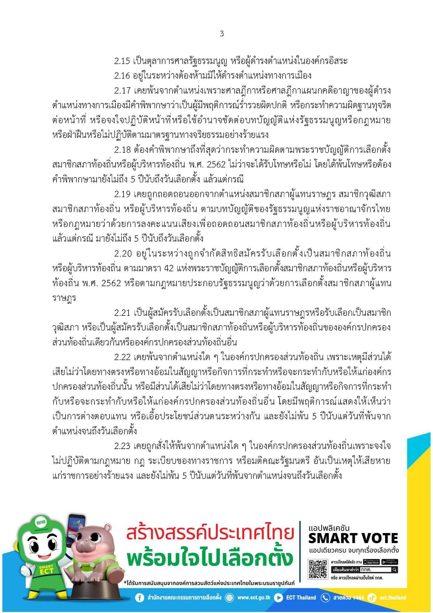 2.21 เป็นผู้สมัครรับเลือกตั้งเป็นสมาชิกสภาผู้แทนราษฎรหรือรับเลือกเป็นสมาชิกวุฒิสภา หรือเป็นผู้สมัครรับเลือกตั้งเป็นสมาชิกสภาท้องถิ่นหรือผู้บริหารท้องถิ่นขององค์กรปกครองส่วนท้องถิ่นเดียวกันหรือองค์กรปกครองส่วนท้องถิ่นอื่น