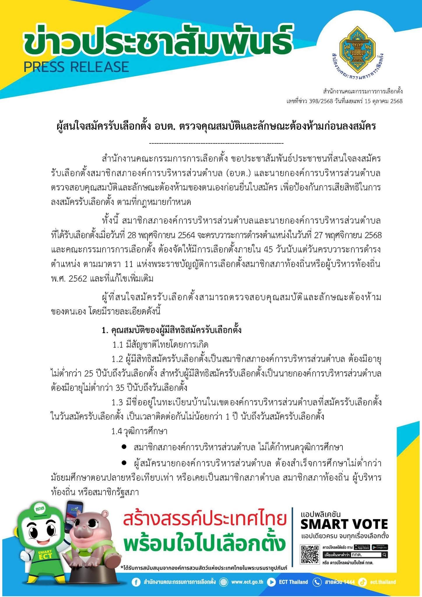 สำนักงานคณะกรรมการการเลือกตั้งเผยแพร่ข่าวเลขที่ 398/2568 วันที่ 15 ตุลาคม 2568