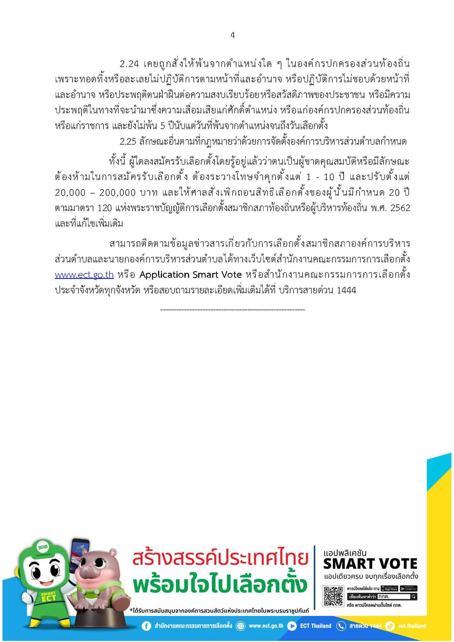 2.4 เป็นบุคคลผู้มีลักษณะต้องห้ามมิให้ใช้สิทธิเลือกตั้งตามพระราชบัญญัติการเลือกตั้งสมาชิกสภาท้องถิ่นหรือผู้บริหารท้องถิ่น พ.ศ. 2562 มาตรา 39 (1) เป็นภิกษุ สามเณร นักพรตหรือนักบวช (2) อยู่ในระหว่างถูกเพิกถอนสิทธิเลือกตั้งไม่ว่าคดีนั้นจะถึงที่สุดแล้วหรือไม่ หรือ (4) วิกลจริตหรือจิตฟั่นเฟือนไม่สมประกอบ