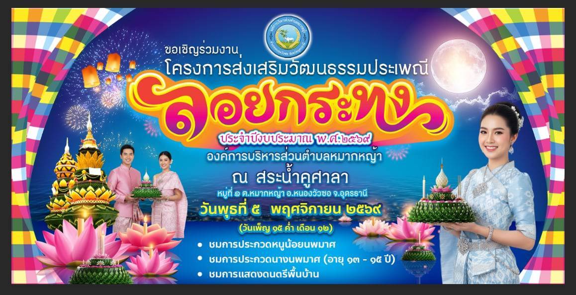 ขอเชิญร่วมงาน โครงการส่งเสริมวัฒนธรรมประเพณี ลอยกระทง ประจำปีงบประมาณ พ.ศ.2569 ในวันพุธ ที่ 5 พฤศจิกายน 2568 ณ สระน้ำคูศาลา หมู่ที่ 1 บ้านหมากหญ้า |