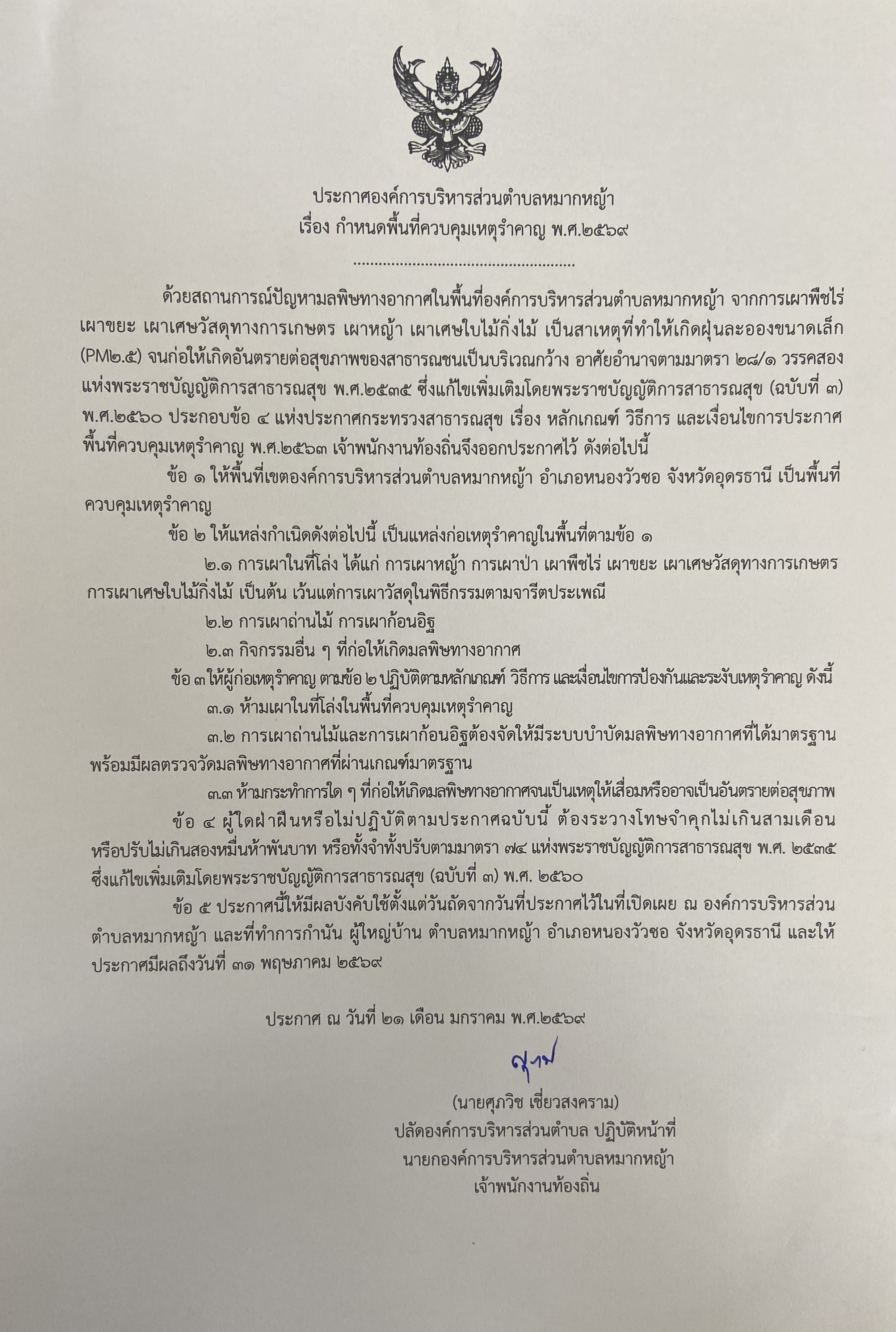 ประกาศองค์การบริหารส่วนตำบลหมากหญ้า เรื่อง กำหนดพื้นที่ควบคุมเหตุรำคาญ พ.ศ.2569 |